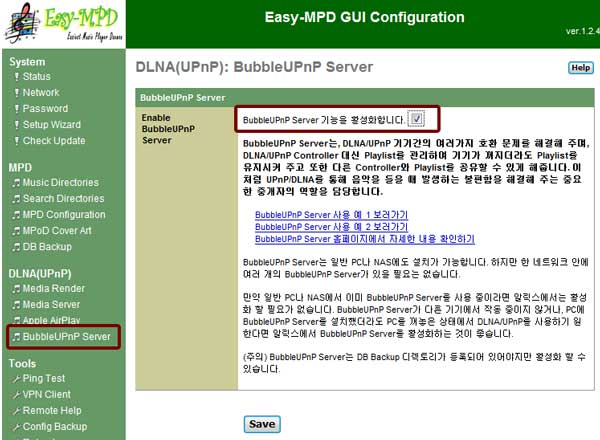 - EasyMPD WEB GUI 좌측 메뉴 중 “DLNA(UPnP) -> BubbleUPnP Server”로 이동 한 후, 우측 설정 페이지에서 “BubbleUPnP 기능을 활성화 합니다.” 우측의 체크 박스를 선택하고 페이지 아래의 “Save” 버튼을 클릭합니다.