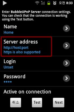 - 아래와 같은 페이지가 열리면, 자신이 원하는 Name을 입력(그림 예에서는 "Home"을 입력했습니다.)하고, Server address에 공유기 DDNS 설정에서 등록한 도메인 네임을 입력합니다. 입력 형식은 "http://도메인 네임:58050" 이렇게 입력합니다. 그림 예제는 "http://myhome.iptime.org:58050"을 입력했습니다. 여기서 myhome.iptime.org를 자신의 공유기에 등록한 도메인 네임으로 교체해 입력하면 됩니다. Login과 Password에는 BubbleUPnP Server 설정에서 입력했던 것을 동일하게 입력하면 됩니다.